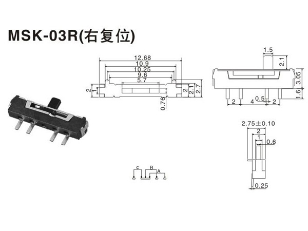 小撥動開關MSK-03R (右復位).產品廣泛應用于計算機周邊、多媒體音響、家電儀器、電子玩具、視聽設備、通訊設備等。